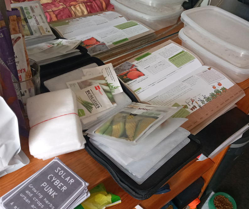 I keep a small guide with common herbs and crops to consult for simple info. I have one of those CD holder-cases that I keep my seeds in. I have a small stack of bio-degradeble baggies that I put sprouts in for donation or putting outside. I keep 2 containers of some tupperware rip-off to pre-grow seeds in. Beyond this I simply bought 20-packs of small pots and ones I got from green libraries.