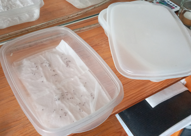 You want to start by looking at what grows well in your area, get yourself some plastic little boxes that light can sorta pass through, you want to put a piece of kitchen roll or toilet paper in there, space out our seeds on it and then cover it again with paper, You pour a little water on it and put the lid on, keep it in a well light place and warm enough, about 10 celcius is the best,