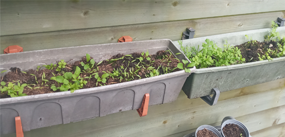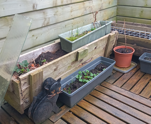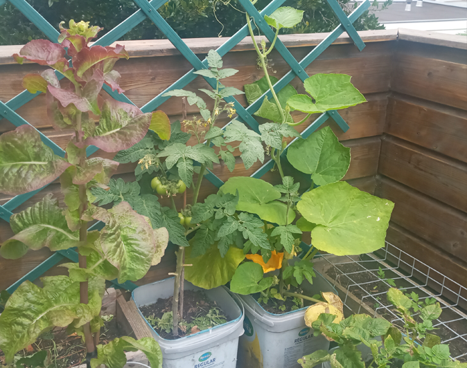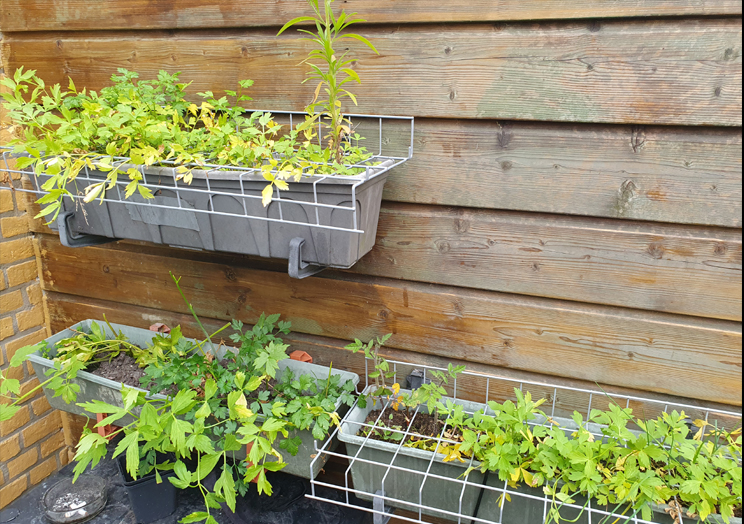 I'm looking to put lettuce in the wooden planters together with maybe carrots if I have the room, herbs go in the plastic dark grey planters and tomatoes and potatoes in the grey bins,