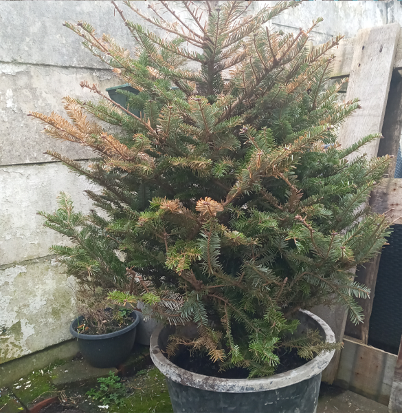 They also picked up another baby pine tree that did have roots this year, I found a okay enough bin in the trash to use as a pot for now, but if this baby wants to grow, we're gonna need something like 3 times this size,