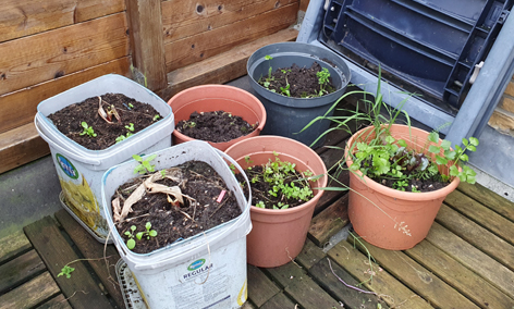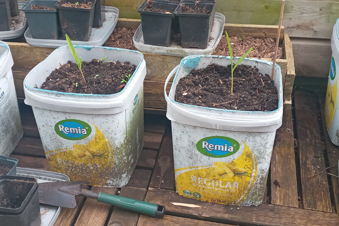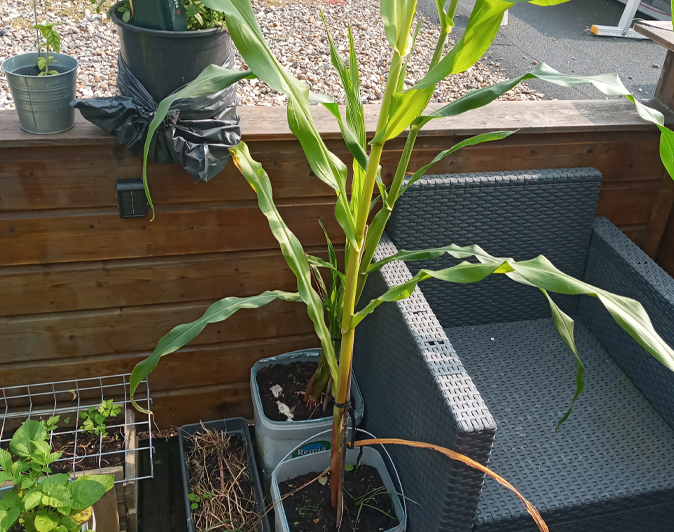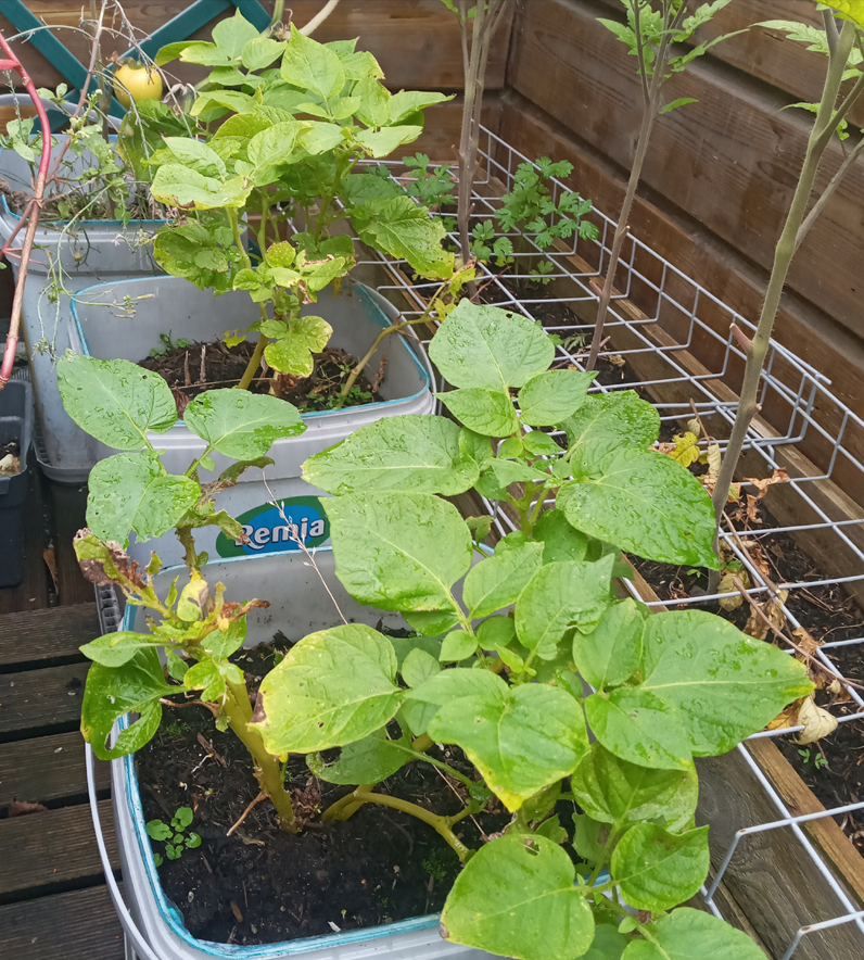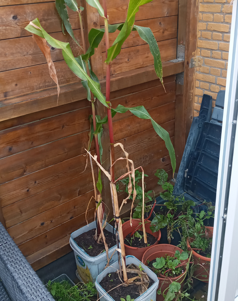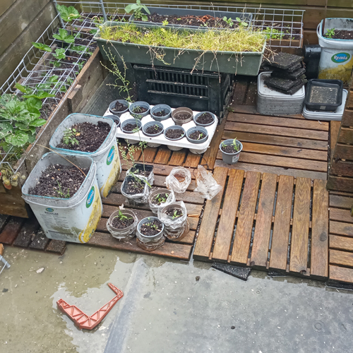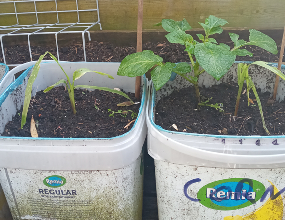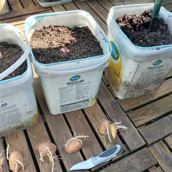 The first 2 lads of corn are having a bad time, they got hit by hail and birds one to many times, A random potato did start growing real quick and sneakily ouf of the right pot though