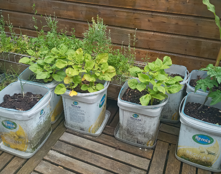 I've already harvested and uprooted the tomatoes, lettuce and the random radishes I planted here and there. Soon I'll get to the potatoes and I'll find a bigger, better pot for that one decorative plant I got a little bit ago. I've also scattered around some Tuinkers (?) because they grow instantly anyway. Can always just pluck, wash 'em and throw them on random food.