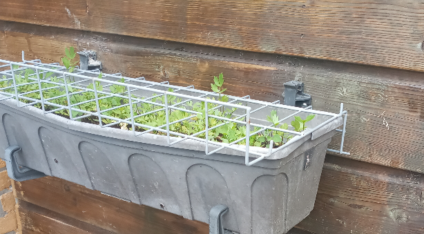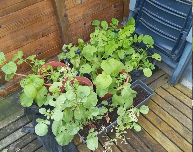 I also have 6 pots and a small rectangle planter with Raddish! I have the black little net there to cover it, but sometimes bugs still sneak in and take some bites.