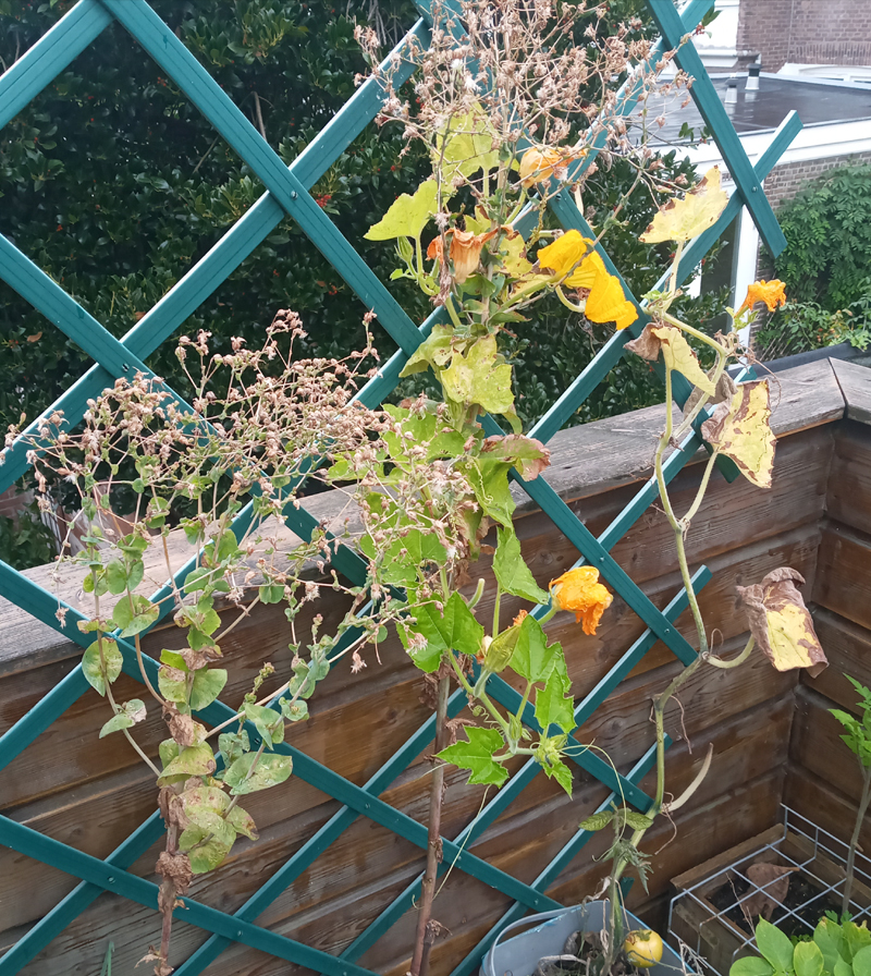 I tried 1 more pumpkin and while it didn;t really produce anything, it did help get bees to the little garden, so it well earned it's keep. It's lower leaves are running yellow and crusty, but the uppper half that has wrapped itself around a lettuce plant is having the time of it's life.